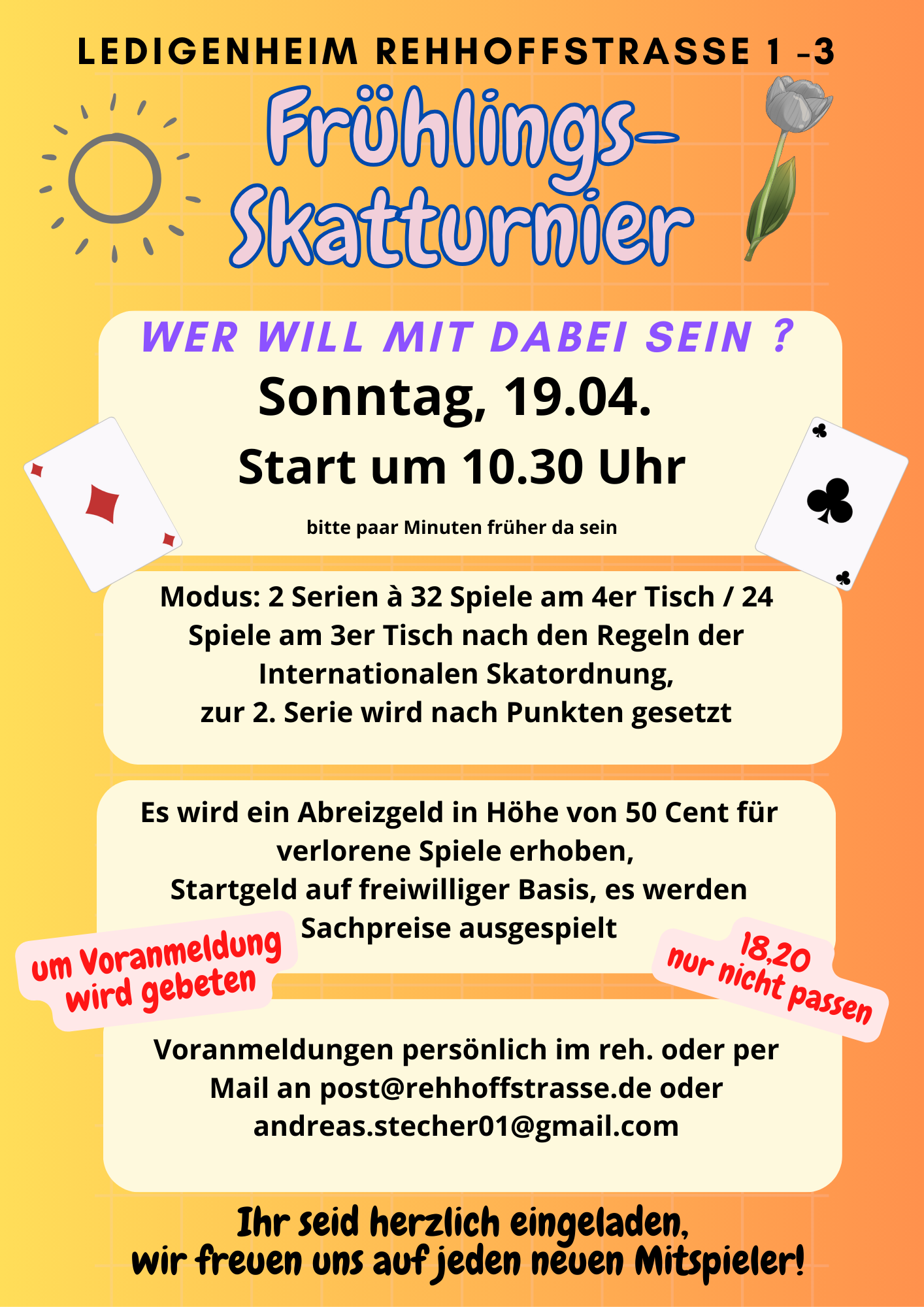 Start um 10.30 Uhr (bitte ein paar Minuten früher da sein)Modus: 2 Serien à 32 Spiele am 4er-Tisch / 24 Spiele am 3er-Tisch nach den Regeln der Internationalen Skatordnung, zur 2. Serie wird nach Punkten gesetzt.